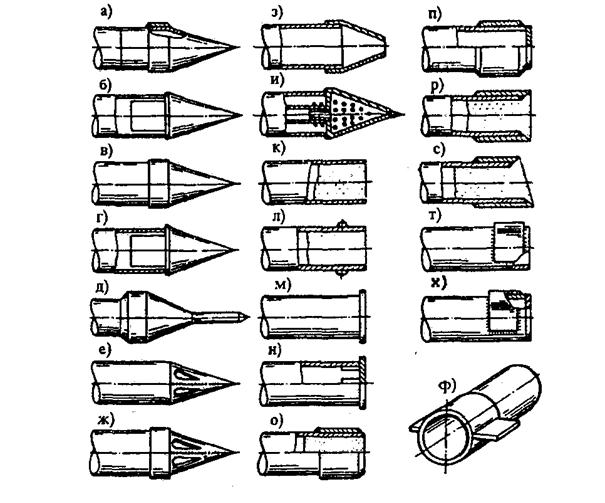 а, б, в – конусные, г – конусные с эксцентриситетом, д – конусные со штырем, е, ж – конусные с щелевыми прорезями, з – конусный с усеченной вершиной, и – конусный с отверстиями для увлажнения грунта, к – открытый конец трубы, л – открытый конец трубы с кольцом, м – приварная заглушка, н – съемная заглушка, о кольцевой нож с наружным скосом кромок, п – то же, с приварной заглушкой, р – кольцевой нож с внутренним скосом кромок, с – кольцевой нож клиновидной формы, т – нож серповидного сечения, х – то же, с приварной заглушкой, ф – кольцевой нож с направляющими пластинами