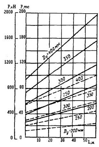 Рис. 6.29 – График для определения необходимого усилия для прокола труб разных условных диаметров Dу на длину L, м в песчаных (сплошные кривые) и глинистых (пунктирные) грунтах