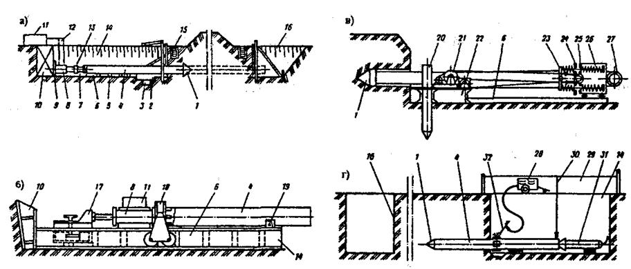 а - общая схема работ, б - прокол установкой ГПУ-600, в - вибропрокол установкой УВВГП-400, г - прокол труб с помощью вибропробойника; 1 - наконечник, 2, 3 - приямки, 4 - прокалываемая труба, 5 - шпалы, 6 - направляющая рама, 7 - нажимной патрубок, 8 - гидродомкраты, 9 - опорный башмак, 10 - упорная стенка, 11 - насосная станция, 12 - маслопрвод, 13 - нажимная заглушка, 14, 16 - рабочий и приемный котлованы, 15 - обводной лоток, 17 - подвижный упор, 18 - нажимная плита на тележке, 19 - фиксатор, 20 - свая, 21 - лебедка, 22 - рама, 23 - планка, 24 - ударная приставка, 25 - направляющие стержни, 26 - вибрационный механизм, 27 - электродвигатель, 28 - электросварочный агрегат, 29 - причалка, 30 - отвес, 31 - пневмопробойник, 32 - сварка труб