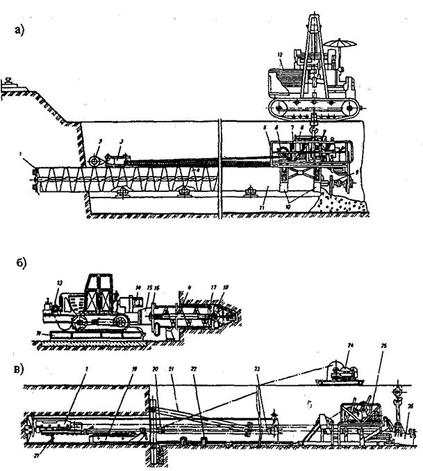 1 – режущая головка, 2 – упорный якорь, 3 – полиспаст, 4 – шнек, 5 – рама, 6 - лебедка, 7 – карданный вал, 8 – двигатель внутреннего сгорания, 9 – вал привода шнека, 10 – хомуты, 11 – прокладываемая труба, 12 – кран-трубоукладчик, 13 – тяговое устройство на тракторе, 14 – сварочный генератор, 15 – коробка отбора мощности, 16 – опорная плита, 17 – люнет, 18 – рабочий орган, 19 – совок, 20 – обойма блока, 21 – опорная стенка, 22 – направляющая рама, 23 – захват, 24 – лебедка подачи, 25 – разгрузочно-тяговое устройство, 26 – емкость, 27 – разгрузочный обратный клапан