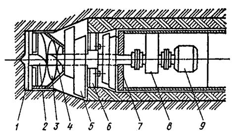 1 – пропеллерный нож, 2 –вал, 3 – шнек, 4 – футляр, 5 – раскатывающее устройство, 7 – устройство вторичного раскатывания, 8 – редуктор, 9 - двигатель