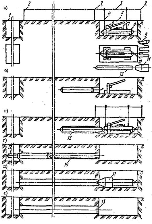 а, б – нацеливание и запуск пневмопробойника, в – установка удлинителя, г - пробивка скважины, д – установка расширителя, е – готовая скважина