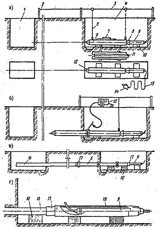 1 – приемный приямок, 2 – вешки, 3 – шнур, 4 – входной приямок, 5 – отвес, 6 - головная секция забиваемой трубы, 7 – линейка с уровнем, 8 – насадка, 9 - пневмопробойник, 10 – прокладка, 11 – секция труб, 12 – оголовок, 13 – шланг, 14 – компрессор, 15 – сварочный агрегат, 16 – извлекаяемая труба, 17 – переходная втулка, 18 – приспособление для извлечения труб