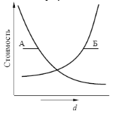 | Стоимость измельчения фосфата А и стоимость его разложения Б в зависимости от диаметра частиц дробленого фосфата d |