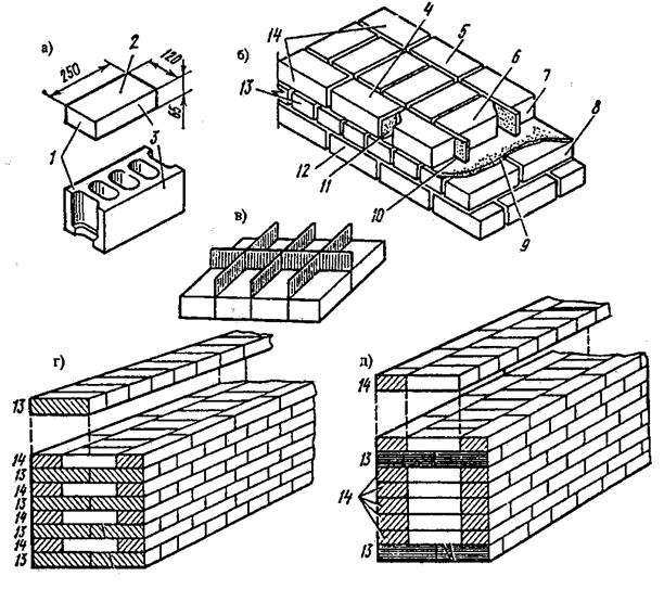 Различают следующие виды кладок: кирпичную из керамического кирпича, из бетонных камней, из силикатного кирпича и керамических пустотелых камней; из крупных бетонных, силикатных или кирпичных блоков; из природных камней; бутовую и бутобетонную; многослойную и облегченную кладку с введением слоя утеплителя. Основные элементы камней и каменной кладки приведены на рис. 9.1, а, б.