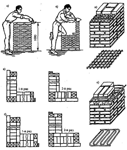 Армированная кирпичная кладка представляет собой кладку, усиленную стальной прутковой арматурой или полосовой сталью, которую укладывают на растворе в швы между кирпичами. Армирование может быть поперечным и продольным. Поперечное применяют в кладках столбов, стен, простенков, работающих преимущественно на сжатие, с использованием стержневых сеток прямоугольной (рис. 9.2, д) и зигзагообразной (рис. 9.2., е) форм при диаметре стержней 3... 8 мм.