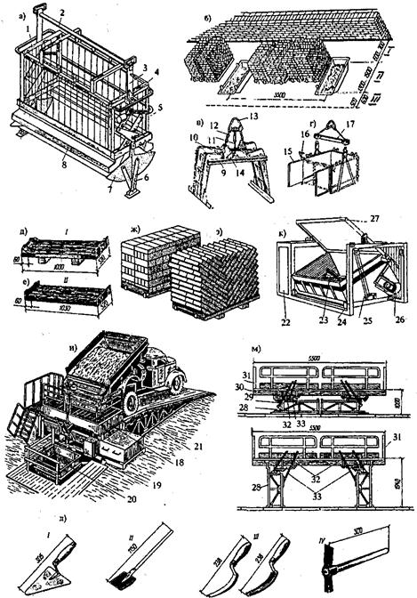 Запас кирпича или камня на рабочем месте не должен превышать 2 - 4 часовой потребности. Раствор загружают в ящики вместимостью до 0,3 м3 непосредственно перед началом работы из расчета на 40... 45 мин. работы. Если кирпич доставлен не на поддонах, а в пакетах, то его подают краном на рабочее место каменщиков с помощью специального полуавтоматического захвата (рис 9.3, а), а для подъема кирпича на поддонах применяют захваты-футляры (рис. 9.3, в, г). Для приема раствора, его перемешивания и выдачи используют соответствующие установки эстакадного (рис. 9.3, и) и безэстакадного (рис. 9.3, к) типа.