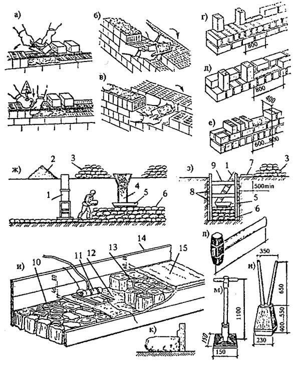 а - укладка наружной тычковой версты, б - укладка забутки, в - укладка керамических камней внутренней версты, г, д, е - основные приемы укладки бетонных камней, ж, з - организация бутовой кладки, и - бутовая кладка «под лопатку», к - то де, под скобу, л, м, н - используемые инструменты (молоток кулачок, металлическая и деревянная трамбовки); 1 - желоб, 2 - щебень, 3 - бутовый камень, 4 - лоток, 5 - ящик для раствора, 6 - кладка, 7 - настил, 8 - крепление стенок траншеи, 9 - распорки, 10 - первый слой камня, 11 - площадочный вибратор, 12, 15 - раствор, 13 - второй слой камня, 14 - опалубка
