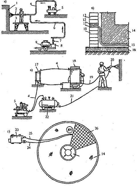 Рис. 11.1 – Схема устройства различных видов гидроизоляции: а - окрасочной, б - деталь перехода с горизонтальной оклеечной на вертикальную, в - цементно-песчаной, г - литой мастично-битумный при гидроизоляции днища радиального отстойника: 1 - изолируемая поверхность, 2 - форсунка, 3 - подмости, 4 - воздуховод, 5 - компрессор, 6 - мастикопровод, 7 - пробочный кран, 8 - насос, 9 - бак для эмульсии или холодной мастики, 10 - защитная стенка в 1/2 кирпича, 11 - слои горизонтального ковра, 12 - доска, 13 - разбираемая часть стенки, 14 - изолируемое сооружение (резервуар), 15 - защитный слой из цементно-песчаного раствора, 16 - бетонная подготовка, 17 - воздухоочиститель, 18 - цемент-пушка, 19 - материальный шланг, 20 - сопло, 21 - водяной шланг, 22 - бак с водой, 23 - передвижная кровельная установка, 24, 25 - шланги для подачи соответственно сжатого воздуха и мастики, 26 - готовый участок гидроизоляции, 27 - коническая часть днища отстойника