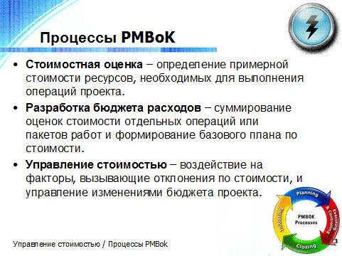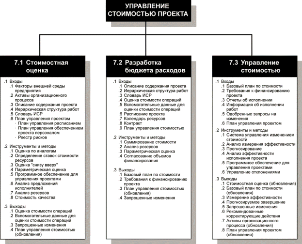 Управление стоимостью проекта объединяет процессы, выполняемые в ходе планирования, разработки бюджета и контролирования затрат, и обеспечивающие завершение проекта в рамках утвержденного бюджета.
