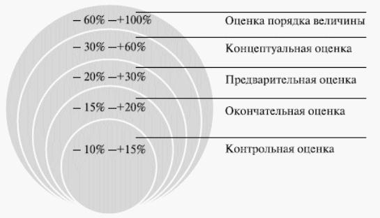 На предпроектной стадии первоначально может определяться только порядок величины стоимости. Точность оценки порядка величины стоимости проекта может колебаться от –50% до +100%. Точность концептуальной оценки находится в интервале –30% — +50%. Точность предварительной оценки проекта колеблется от –20% до +30%. На этапе окончательной оценки точность колеблется от –15% до +20%. Контрольная оценка имеет точность от –10% до +15%. Таким образом, каждая последующая стадия жизненного цикла проекта имеет более точную стоимостную оценку (рис. 7.2