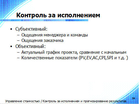 Второй объективный, мы исключаем из рассмотрения наши субъективные ощущения. И делаем наши выводы исходя из количественных оценок. Один из распространенных способов количественного контроля и прогнозирования метод освоенного объема который мы сейчас рассмотрим более подробно.