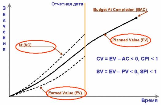 Ø отклонение по стоимости — CV (Cost Variance). Равно разнице между плановой стоимостью выполненной работы и ее фактической стоимостью: CV = EV – AC;