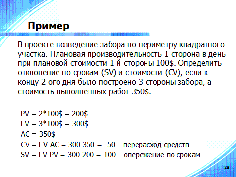 Ø коэффициент выполнения календарного плана (или индекс выполнения сроков) — SPI (Schedule Performance Index). SPI = EV / PV.