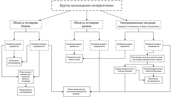 Принимать решения при неэффективном движении по градиенту гораздо сложнее. Принятие решений во многом зависит от определенности ситуации (далеко от оптимума, близко, неопределенно) и от адекватности линейной модели. Наиболее типичные случаи показаны на блок-схеме.