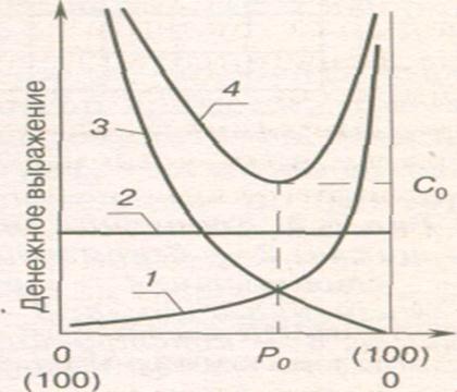 1 — расходы на контроль качества; 2 — основные издержки производства; 3 — потери из-за дефектности; 4 — общая сумма издержек на производство