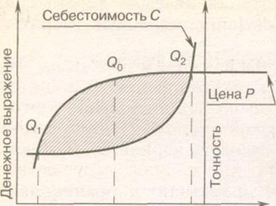Как видно из рис.2.15, та часть ординат, которая заключена между кривой стоимости С и ценовой кривой Р изделия и ограничена точками Q1 и Q2, отражает рентабельность производства и является основанием для повышения качества изделий на производстве. Точка наибольшего отдаления Q0 определяет прибыль, соответствующую оптимальному качеству. Определение прибыли с учётом качества всегда остается в кругу вопросов стратегии и тактики производства, определяет целесообразность его автоматизации и выпуска изделия с учётом технического состояния конструкции. Оценка по состоянию конструкции изделия осуществляется в двух вариантах: без учёта и с учётом возможного морального старения изделия.