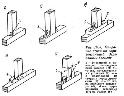 Площадка контакта и распределение усилий сжатия на большую поверхность может быть увеличена с помощью подкладок из твердых пород древесины, имеющих повышенное сопротивление смятию поперек волокон (рис. IV.3, в) или подкладки из металлических профилей (рис. IV.3, г), а также деревянными вставками в опорные части стоек (рис. IV.3, д),