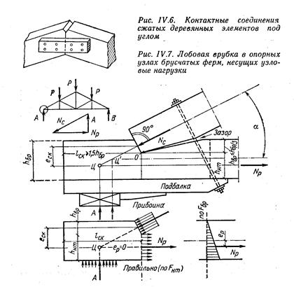 Работа древесины в местах соединения по контактным поверхностям на смятие под углом возникает в со единениях деревянных элементов, находящихся под различными углами, например стык наклонных деревянных элементов (рис. IV.6). В этих случаях древесину по контактной поверхности проверяют на смятие под углом.