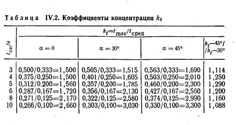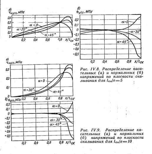 В результате анализа установлено, что с увеличением глубины врубки / hвр при постоянной длине плоскости скалывания lск снижается коэффициент концентрации напряжений сдвига и уменьшаются напряжения сжатия поперек волокон в начале плоскости скалывания. Выявлена зависимость коэффициента концентрации напряже ний сдвига tmax/ tсред от отношения 1ск/е и от угла смятия α (табл. IV.2).