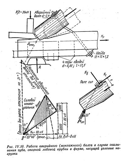 Сложное напряженно-деформированное состояние нагельного соединения характеризуется изгибом нагеля, смятием древесины нагельного гнезда, скалыванием и раскалыванием древесины между нагелями,