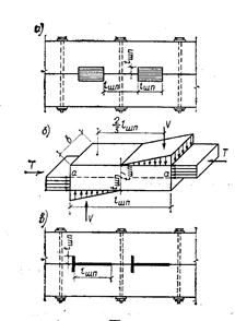 Шпонки — это вкладыши из твердых пород древесины, стали или из пластмасс, которые устанавливаются между сплачиваемыми элементами и препятствуют сдвигу. Для сплачивания деревянных элементов издавна применялись призматические шпонки из твердых пород древесины. Различают призматические деревянные продольные шпонки (рис. IV. 11,а), когда направления волокон древесины шпонок и соединяемых элементов совпадают, и поперечные, когда направление волокон в шпонках перпендикулярно к направлению волокон соединяемых элементов. Во втором случае для обеспечения более плотной посадки шпонок они могут быть выполнены из двух клиновидных элементов.