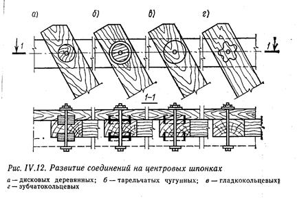 Для соединения элементов деревянных конструкций под различными углами в узлах ставят круглые центровые шпонки. Характерная особенность всех центровых шпонок — наличие в центре отверстия для стяжного болта. Отверстие для этого болта в соединяемом элементе можно использовать при нарезке круглых или кольцевых гнезд в каждом элементе порознь. На рис. IV. 12 показано развитие центровых шпонок и их переход к шайбам шпоночного типа. Центровые односторонние шайбы шпоночного типа воспринимают усилия от центрального болта и рассредоточено передают их на деревянный элемент.