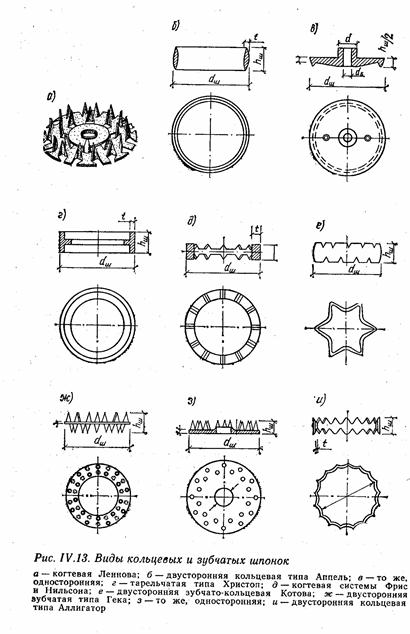Зубчатые шпонки могут иметь зубья или когти с одной или двух сторон. Односторонние зубчатые шпонки применяют обычно для устройства сборно-разборных соединений или для прикрепления деревянных элементов к металлическим. В нашей стране проф. В. Г. Ленновым были предложены штампованные ногтевые шайбы (рис. IV. 13,а). Этот тип зубчатых шпонок нашел применение и дальнейшее развитие в зару-