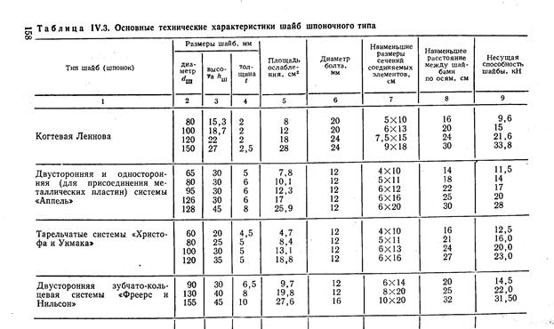 Основные формы и виды шайб шпоночного типа современных деревянных конструкций показаны на рис. IV. 13. В табл. IV.3 даны их основные характеристики. При сплачивании клееных деревянных элементов с помощью шайб шпоночного типа Они могут иметь прямую расстановку или располагаться в шахматном порядке с шагом пропорционально диаметру шпонок (см. табл. IV.3).
