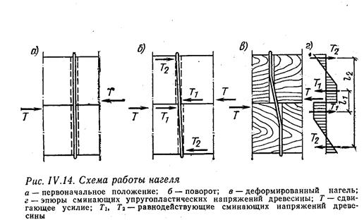 Работу нагеля можно рассмотреть на примере соединения двух сдвигаемых элементов (рис. IV, 14).