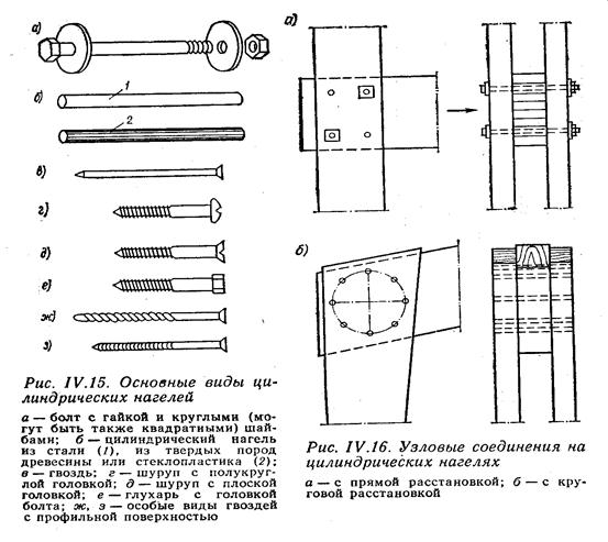 Цилиндрические нагели изготовляют в виде гладких стержней круглого сечения из стали, металлических сплавов, твердых пород древесины и из пластмасс. По характеру своей работы в соединениях сдвигаемых элементов к цилиндрическим нагелям относятся также болты, гвозди, глухари (винты большого диаметра с шестигранной или четырехгранной головкой) и шурупы (рис. IV. 15). Цилиндрические нагели устанавливают в предварительно рассверленные гнезда.