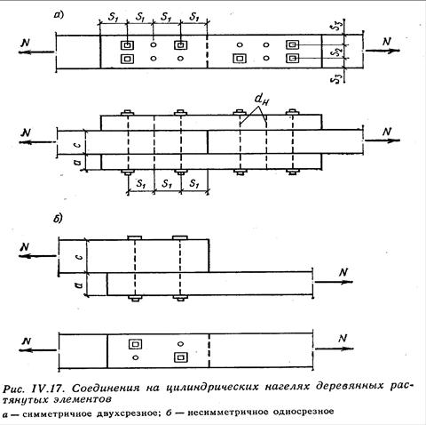 Цилиндрические нагели и болты применяют для сплачивания элементов деревянных конструкций, соединения их по длине (рис. IV. 16, а), а также в узловых примыканиях (рис. IV. 16, б). Соединения деревянных элементов на нагелях бывают симметричными и несимметричными.