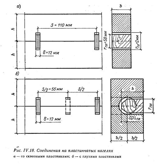 Для сплачивания двух или трех брусьев, составленных по высоте, применяют пластинчатые нагели, вставляемые в гнезда, прорезаемые цепнодолбежным станком (рис. IV. 18).