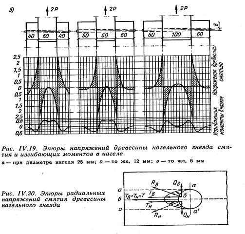 Для определения несущей способности одного среза нагеля следует рассмотреть напряженное состояние нагельного соединения. Действующие в соединяемых элементах усилия стремятся сдвинуть их относительно друг друга. Нагель, препятствуя этому, изгибается. Изгиб нагеля зависит от жесткости самого нагеля и смятия древесины нагельного гнезда. Нагель можно рассматривать как балку, лежащую на сплошном упругопластическом основании — древесине нагельного гнезда. Напряжения смятия в древесине по длине нагеля неравномерны. Эта неравномерность тем значительнее, чем меньше жесткость нагеля (рис. IV. 19). Неравномерно также распределение сминающих напряжений по контуру нагельного гнезда (рис. IV. 20). Равнодействующие радиальных напряжений, расположенных выше и ниже продольной оси x—х, направлены под углом к этой оси и, будучи разложены, дают две составляющие — продольную Т и поперечную Q. Продольная составляющая Т=Тн+Тв вызывает появление напряжений скалывания по площадкам а—а и а'—а'. Поперечные составляющие QH и QB стремятся расколоть деревянный элемент по линии б—б. Еще более сложно напряженно-деформированное состояние нагельного соединения деревянных элементов, расположенных под различными углами.