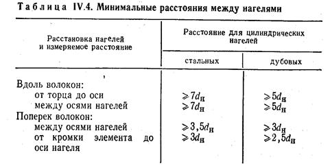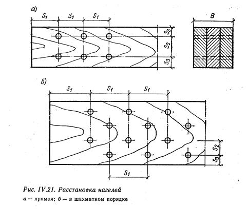 Минимальные расстояния между осями нагелей принято выражать в диаметрах нагеля. Они определяются видом нагелей и толщиной соединяемых элементов. Расстановка нагелей в соединениях может быть прямой или в шахматном порядке (рис. IV. 21). В табл. IV.4 приведены рекомендуемые СНиП П-25-80 минимальные расстояния между цилиндрическими нагелями