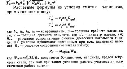 По аналогии с соединениями на заклепках в металлических конструкциях каждое пересечение нагеля с рабочим швом называется «срезом». Однако при общности действующих явлений в том и в другом случае работа нагеля в соединениях деревянных элементов значительно отличается от работы заклепки в металлических элементах. Заклепка соединяет тонкие стальные элементы. Отношение длины заклепки к ее диаметру невелико, что характеризует большую относительную жесткость, при которой изгибные напряжения не имеют существенного значения и могут не учитываться. Несущую способность заклепки определяют из расчета на смятие и срез.
