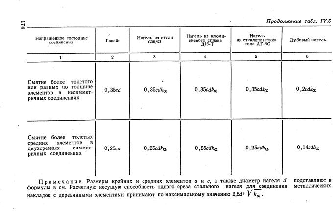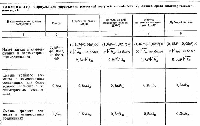 Округляя результаты графического решения и вводя расчетные сопротивления древесины смятию и нагеля изгибу, получим формулы для определения несущей способности одного среза различных видов нагелей (табл. IV.5). Формулы отличаются только значениями коэффициентов, равных произведению k и√Rи Rсм; k 1 Rсм; k 2 Rсм