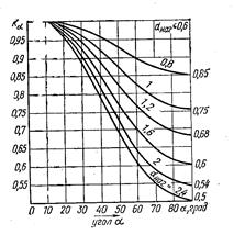 Рис. IV.25. Коэффициенты ka снижения расчетного усилия нагеля для соединений на стальных цилиндрических нагелях при направлении действия силы под углом α, к направлению волокон древесины