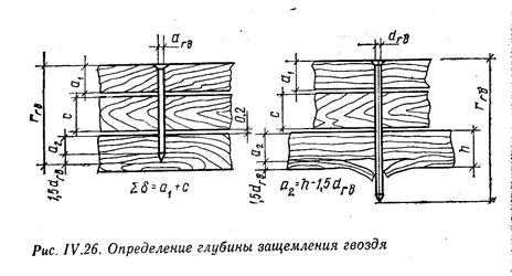 При определении расчетной длины защемления конца гвоздя в последней непробиваемой насквозь доске не следует учитывать часть длиной 1,5 dГв (рис. IV.26). Кроме того, из длины гвоздя при определении длины его защемления следует вычитать по 2 мм на каждый шов между соединяемыми элементами. Если расчетная длина защемления конца гвоздя получается меньше 4 dГв, то его работу в примыкающем к шву элементе учитывать не следует. Диаметр гвоздей принимать не более 0>25 толщины пробиваемого элемента. Если последняя доска пробивается гвоздем насквозь, то, учитывая отщеп ее нижнего слоя, рабочая толщина доски уменьшается на 1,5 dГв.