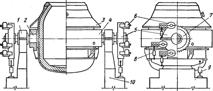 Механизм поворота может быть односторонним (для малык конвертеров – до 100т) и двусторонним (для большегрузных конвертеров), позволяющим более равномерно распределить нагрузки при наклоне конвертера.