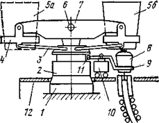 Оборудование для быстрой смены ковшей. Современные МНЛЗ оборудуют поворотными и иногда передвижными стендами, которые обеспечивают подачу ковшей с металлом к машине, взвешивание и установку ковша со скоростями, позволяющими вести разливку методом «плавка на плавку». По конструкции и принципу работы сталеразливочные стенды делятся на два типа – мостовые и поворотные. Все они рассчитаны на установку двух ковшей. Наиболее современный подъемно-поворотный стенд (см. рисунок 33) имеет располагаемую на основании 1 поворотную платформу 2, на которую через ось 6 опирается консоль 7. В подвесках 4 консоли можно установить два ковша (5а и б); вертикальное перемещение ковша достигают качанием консоли, при этом тяга 3 обеспечивает плоскопараллельное движение подвесок и ковшей.