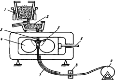 Из всех валковых машин в настоящее время находятся в эксплуатации только двухвалковые машины (рисунок 36). В этих установках кристаллизатор состоит из двух валков, расположенных непосредственно под промежуточным ковшом и вращающихся в противоположных направлениях. Жидкая сталь поступает в пространство между валками и при контакте с поверхностью валков кристаллизуется, образуя корочки, которые двигаются вместе с поверхностью и выходят из валков в форме листа, толщина которого определяется расстоянием между валками, а ширина — боковыми стенками кристаллизатора.