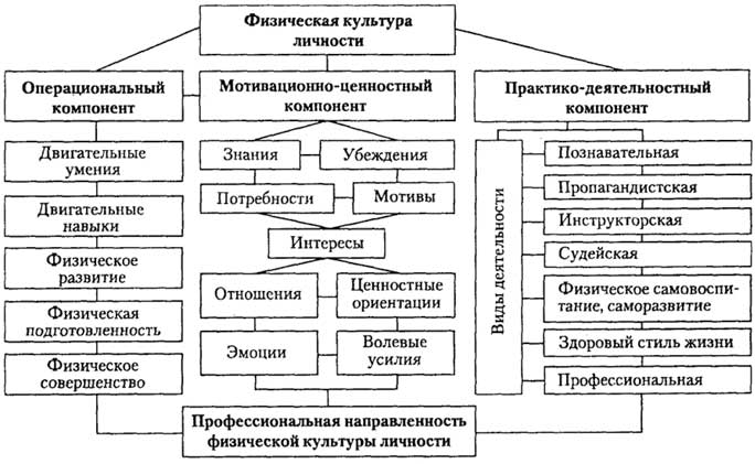Физическую культуру личности представлена структурой. Мотивационно-ценностный компонент отражает активно положительное эмоциональное отношение к физической культуре, сформированную потребность в ней, систему знаний, интересов, мотивов и убеждений, организующих и направляющих волевые усилия личности, познавательную и практическую деятельность по овладению ценностями физической культуры, нацеленность на здоровый образ жизни, физическое совершенствование.