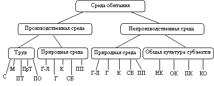 С – субъектов труда, М – "машины" – средств и предметов труда, ПТ – процессов труда, состоящих из действующих как субъектов, так и машин, ПрТ – продуктов труда как целевых, так и побочных в виде образующихся вредных и опасных примесей к воздушной среде и т.п., ПО – производственных отношений (организационных, экономических, социально-психологических, правовых по труду: отношений, связанных с культурой труда, профессиональной культурой, эстетической и т.д.).