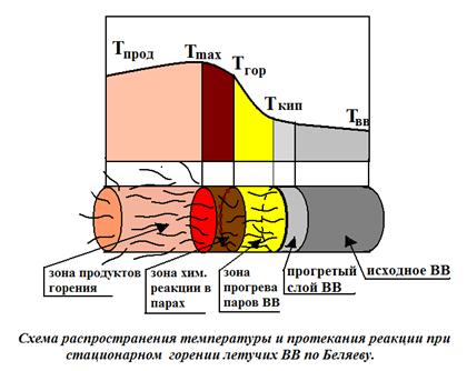 Схема распространения температуры и протекания реакции при стационарном горении летучих ВВ по Беляеву