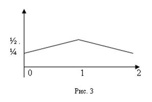 . Если по оси абсцисс отложить x1, x2, …, xn …, а по оси ординат – соответствующие вероятности pi и соединить соседние точки отрезками, то получим многоугольник распределения дискретной случайной величины (рис.1), который является графическим изображением ряда распределения дискретной случайной величины. Например, если Х – число выпадений «решки» при двух подбрасываниях монеты, то ряду распределения, изображенному на рис. 2 будет соответствовать многоугольник распределения, изображенный на рис. 3.