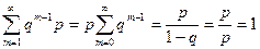 где q = 1–p, p Î(0, 1). Геометрическое распределение имеет случайная величина X, равная числу испытаний по схеме Бернулли до первого наступления успеха с вероятностью успеха в единичном испытании р. Покажем, что Σ p i = 1