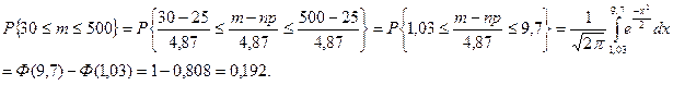 Решение. Партия будет возвращена, если число отобранных приборов, нуждающихся в настройке, будет больше 6%, т.е. m 1 = 500 × 6/100 = 30. Далее: p = 0,05: q = 0,95; np = 25;