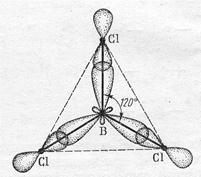 В образовании молекулы ВF3 участвуют 3 гибридных электронных облака атома бора и три р-электронных облака атома фтора. Форма молекул молекулы ВF3 – правильный треугольник на плоскости