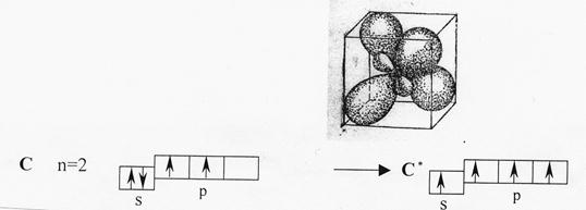 Перестройка электронной структуры атома, представляет собой гибридизацию атомных орбиталей. Из исходных s-, p-, d-орбиталей (электронных облаков) образуются равноценные гибридные орбитали (электронные облака), вытянутые по направлению к соседним атомам. При этом обеспечивается более полное перекрывание с облаками этих соседних атомов, что приводит к выигрышу энергии, достаточному, чтобы с избытком компенсировать затраты на деформацию исходных электронных облаков.